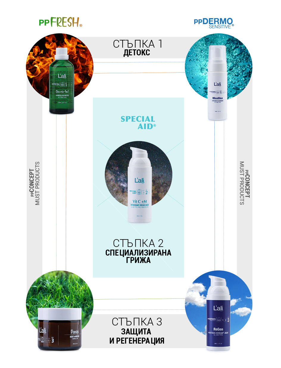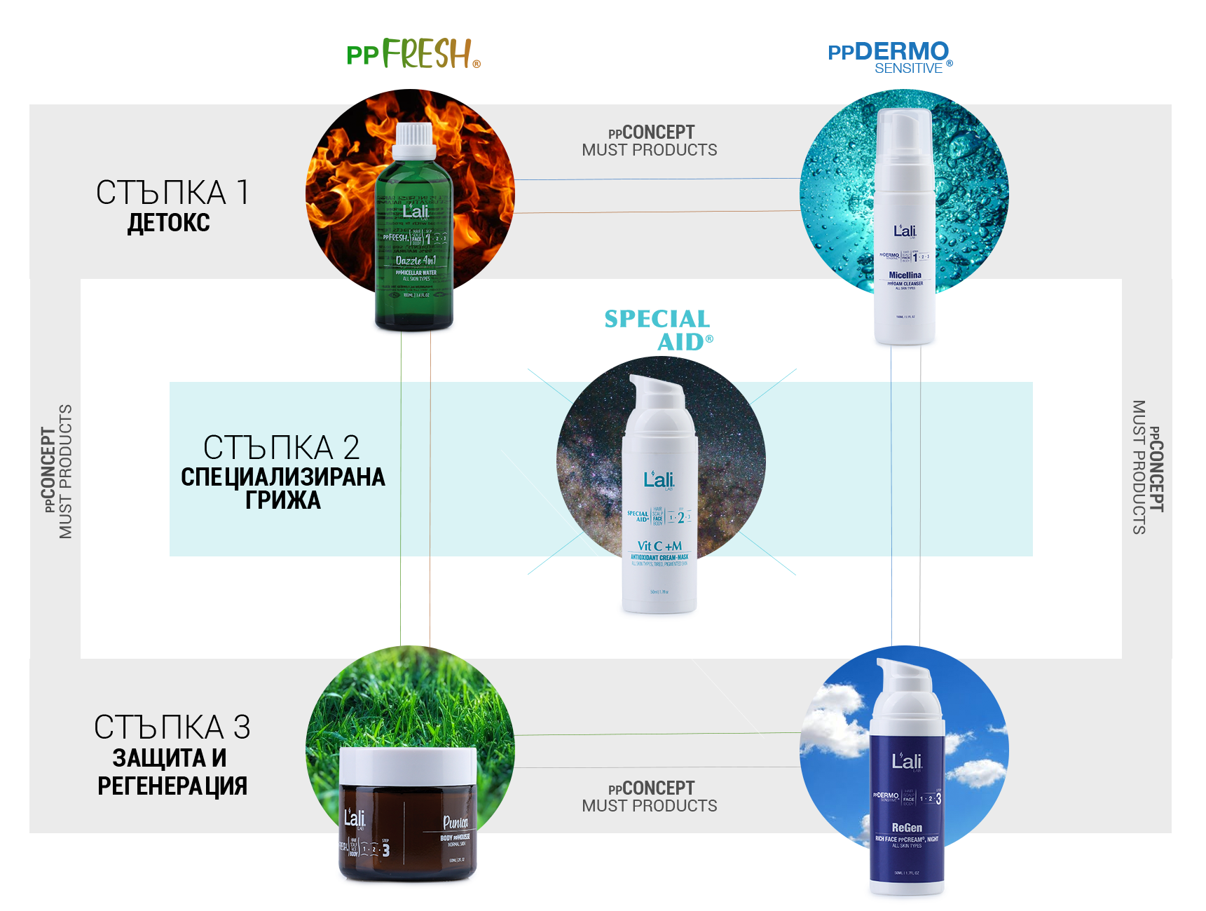 за деликатно наслагване на нужните ти продукти, с точните съставки, последователност, честота и начин на използване за цялостна грижа, и дълготраен ползотворен ефект за здраве и красота на принципа „отвътре-навън“