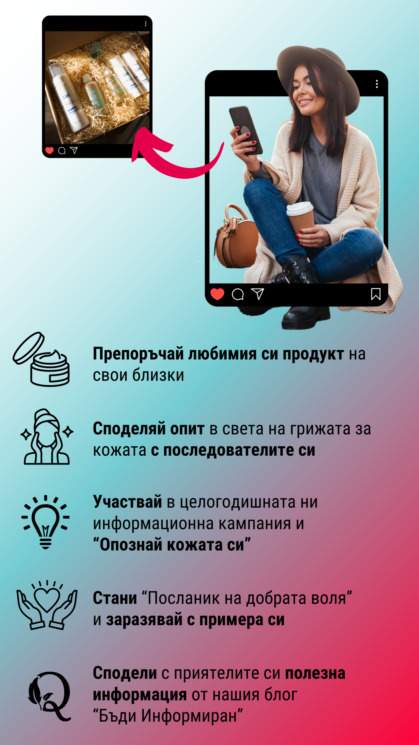 Всеки има свой подход, някои директен, други по-образователен и деликатен. За целта ти предлагаме два варианта, чрез които да достигнеш до продажби чрез препоръки: 1. Индивидуално генериран линк с препоръка на конкретен продукт или терапия 2. Деликатен подход чрез информираност и професионализъм. Сподели полезни статии от Инфо блога ни: „Бъди информиран, бъди осъзнат“. Или пък да участвай като Посланик на добрата воля в ежемесечната ни информационна кампания „Опознай кожата си“, която цели да образова широката аудитория по темата с холистичната грижа и красива кожа, да представи последните научни трудове на достъпен език и да оспори широкоразпространени митове и легенди в сферата на Красотата.ЕФЕКТИВНОСТ