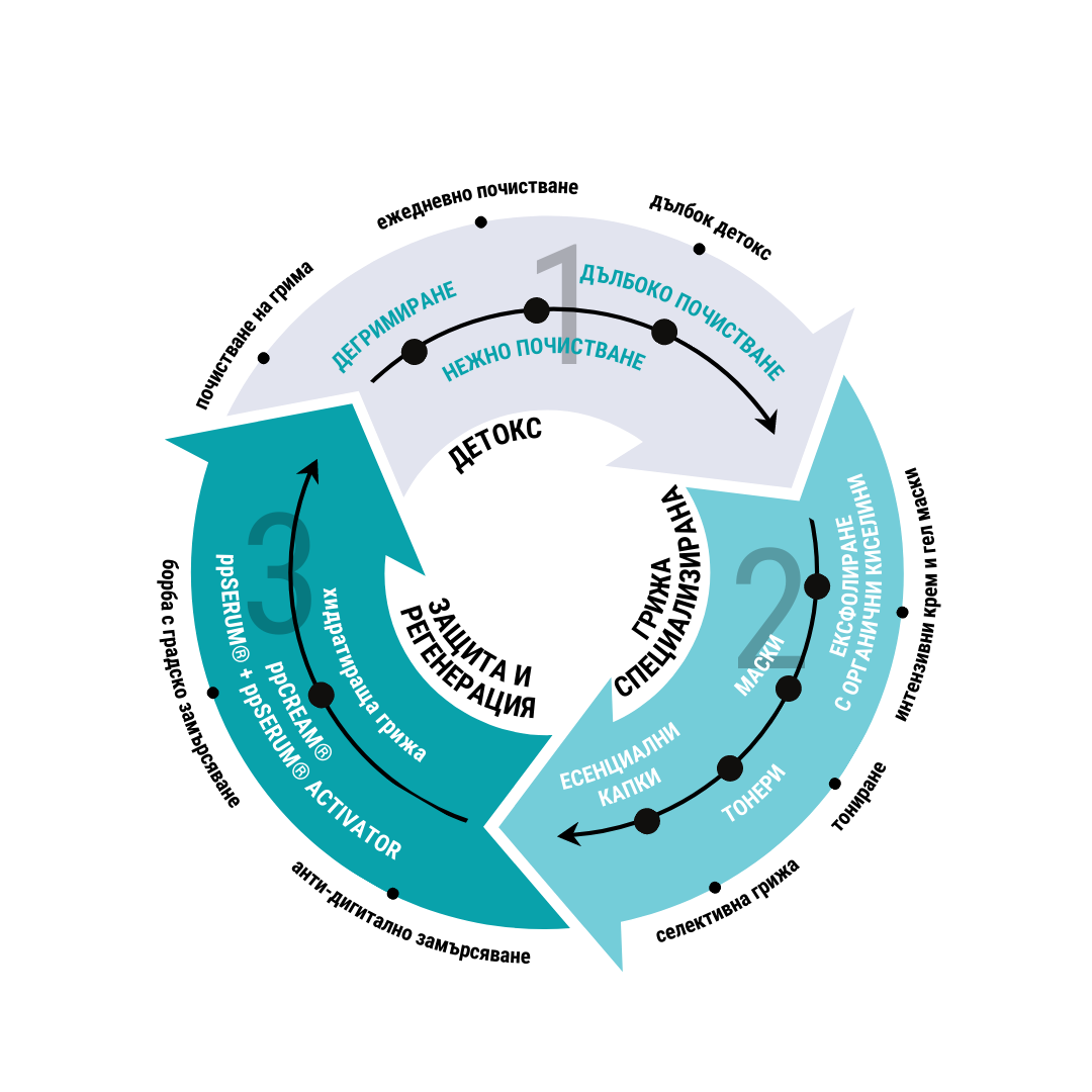 ֎ СТЪПКА 3: ЗАЩИТА И РЕГЕНЕРАЦИЯ – Предвид вредите, които нанася градското замърсяване и модерния начин на живот, използването на допълнителна защита е крайно необходимо. Финишираща грижа за защита, подхранване и подсилване на собствените регенеративни системи, на принципа “отвътре-навън”. Продуктите в стъпки 1 и 3 принадлежат към сериите ppFRESH® и ppDERMO® SENSITIVE, а всички продукти в стъпка 2 са част от серия SPECIAL AID®.