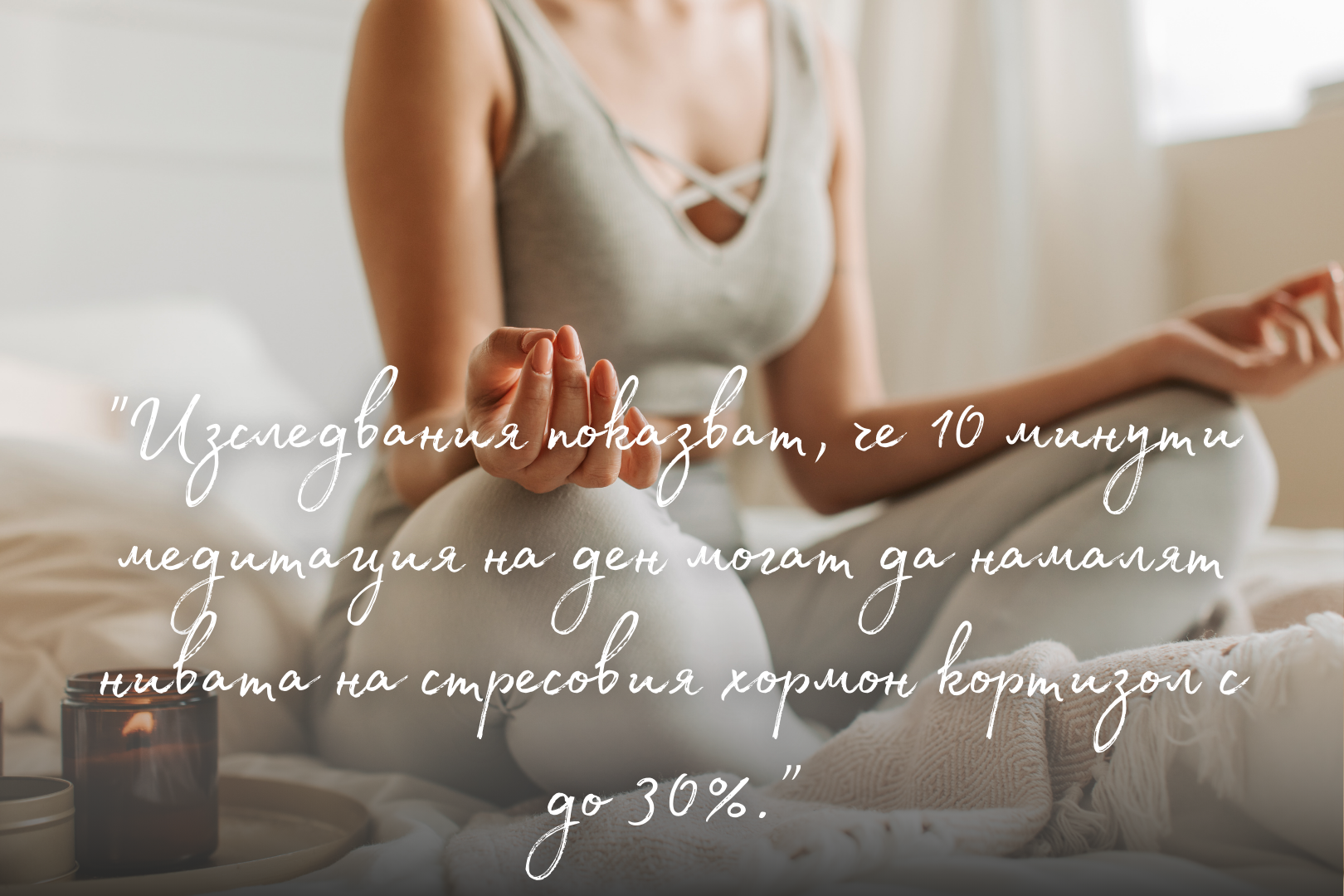 Изследвания показват, че 10 минути медитация на ден могат да намалят нивата на стресовия хормон кортизол с до 30%.