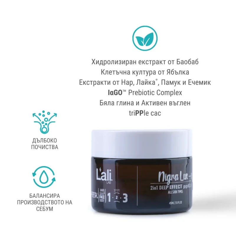 Хидролизиран екстракт от Баобаб; Клетъчна култура от Ябълка; Екстракт от Нар; Екстракт от Лайка˚; Екстракт от Памук; Екстракт от Ечемик, IαGO™ Prebiotic Complex, Бяла глина, Активен въглен, triPPle CAC™ ˚съставки с органичен произход · 100% БИО разградим продукт · Не дразни очите · Не запушва порите