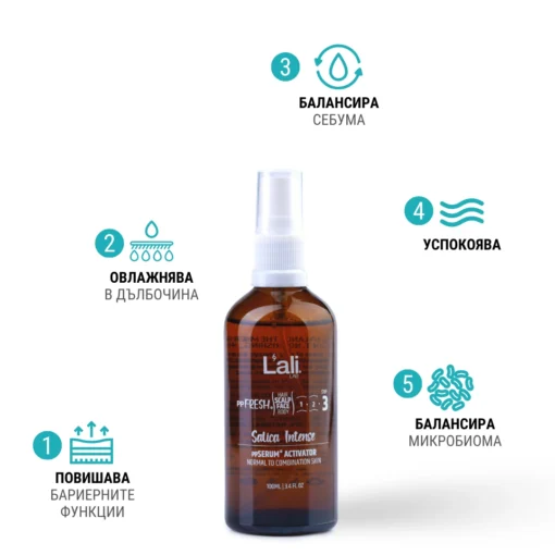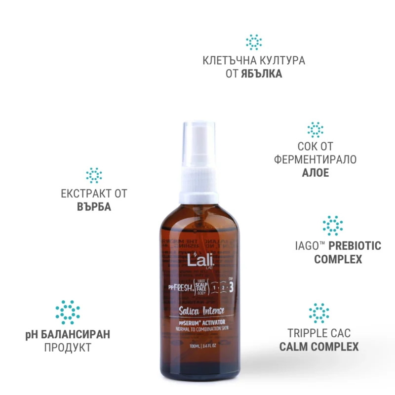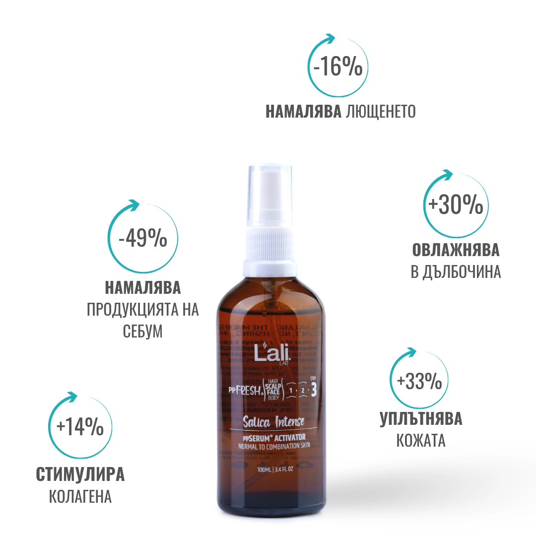 Salica Intense ppSERUM® ACTIVATOR Серия: ppFRESH® Обем: 100мл Предвид вредите, които нанася градското замърсяване и модерния начин на живот, използването на допълнителна защита е крайно необходимо. Финишираща грижа за защита, подхранване и подсилване на собствените регенеративни системи на принципа отвътре-навън! Предназначен за използване по всяко време на деня, винаги в комбинация с Daylight Punica, ppSERUM® DAY, Moonlit Punica, ppSERUM® NIGHT или Bold MEN 24H, ррSERUM® DAY&NIGHT. Използвай за борба с негативните последствия от съвременния начин на живот, стресорите от околната среда и замърсяванията, по всяко време на денонощието. ✓ Спомага за балансиране на микробиома