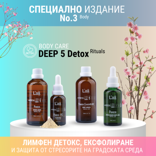 Deep 5 Detox Rituals | ДЕТОКС КОМПЛЕКТ ЗА ТЯЛО Серия: ppFRESH® *Punia Fresh 3 Unit Body ppScrub е предназначен за използване веднъж в седмицата. Ритуал, създаден за да подпомогне естествените детоксикиращи процеси на тялото чрез ексфолиране, лимфен дренаж, хидратация и релаксация. Съчетай на силата на натуралните продукти с доказани техники за детоксикация и стимулиране на лимфната система, за да се погрижиш за кожата си всеки ден и да й осигуриш по-интензивно пречистване веднъж седмично. Използвай за борба с негативните последствия от модерния начин на живот, стресорите от околната среда и различните видове съвременни замърсявания.
