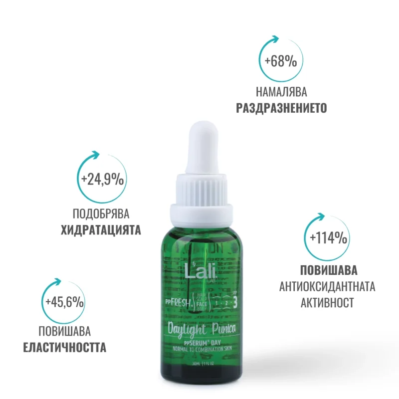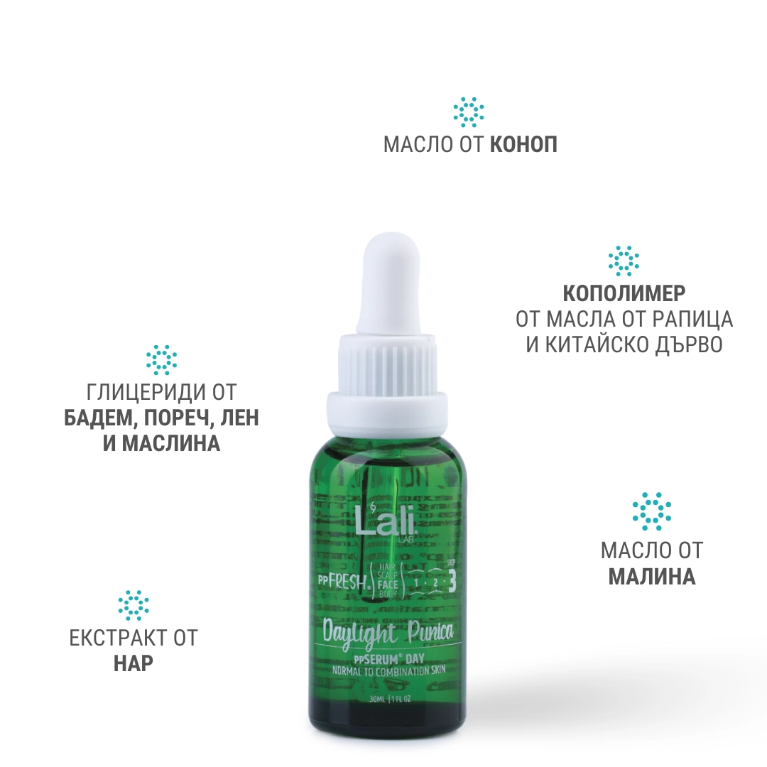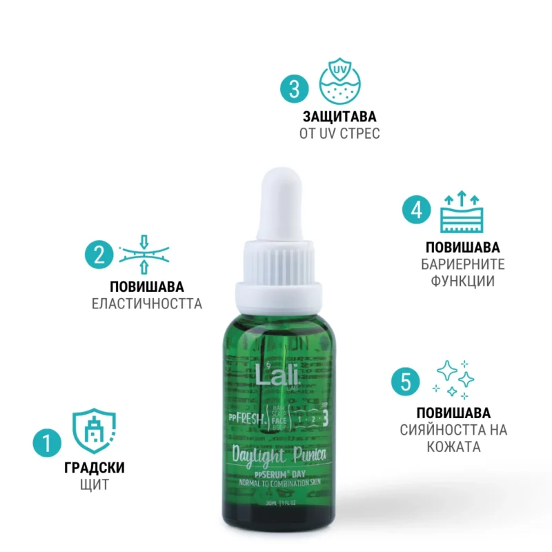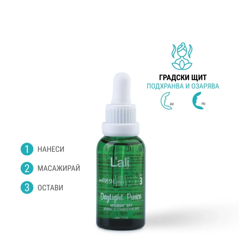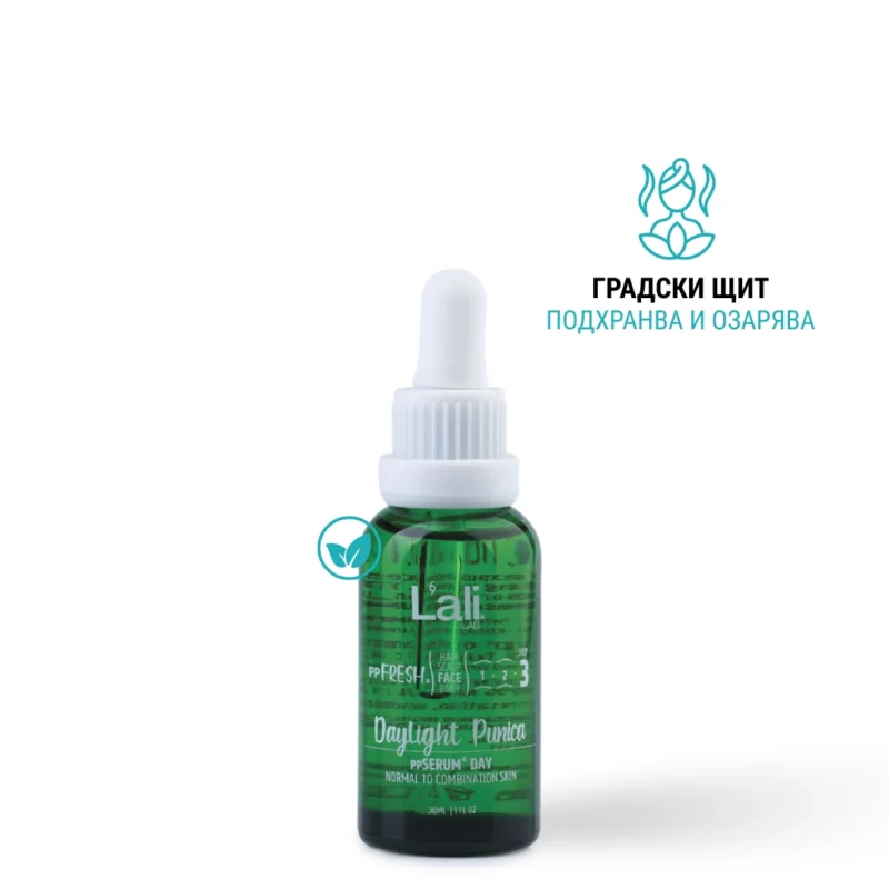 Daylight Punica ppSERUM® DAY Серия:ppFRESH® Обем: 30мл Предвид вредите, които нанася градското замърсяване и модерния начин на живот, използването на допълнителна защита е крайно необходимо. Финишираща грижа за защита, подхранване и подсилване на собствените регенеративни системи на принципа отвътре-навън. Предназначен да предпазва откритото лице от дехидратация и стресорите на околната среда, през деня. Използвай за борба с негативните последствия от съвременния начин на живот и замърсяванията от околната среда, винаги в комбинация с Salica Intense ppSERUM® ACTIVATOR.
