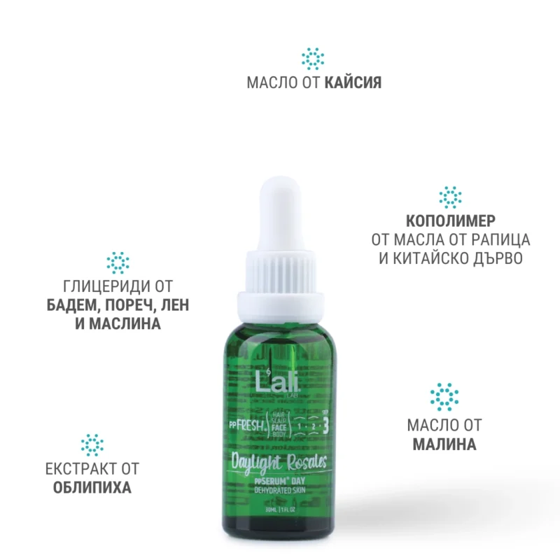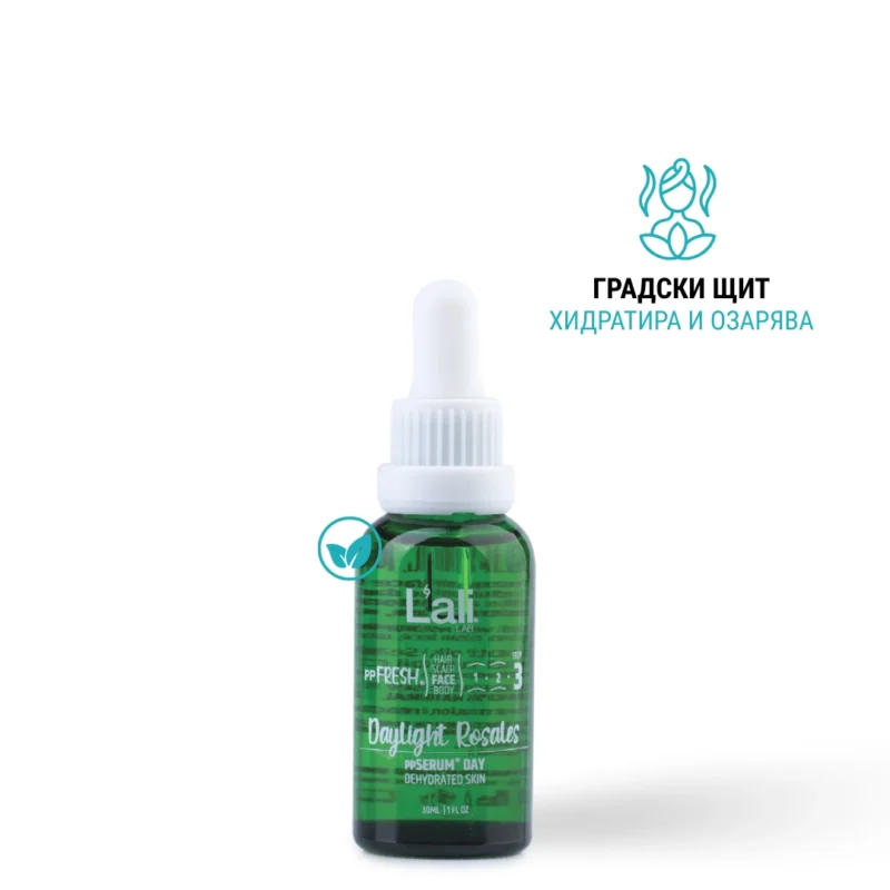 Daylight Rosales ppSERUM® DAY Серия: ppFRESH® Обем: 30мл Предвид вредите, които нанася градското замърсяване и модерния начин на живот, използването на допълнителна защита е крайно необходимо. Финишираща грижа за защита, подхранване и подсилване на собствените регенеративни системи на принципа отвътре-навън. Предназначен да предпазва откритото лице от дехидратация, през деня. Използвай за борба с негативните последствия от съвременния начин на живот и замърсяванията от околната среда! Винаги в комбинация с Astra Intense ppSERUM® ACTIVATOR.