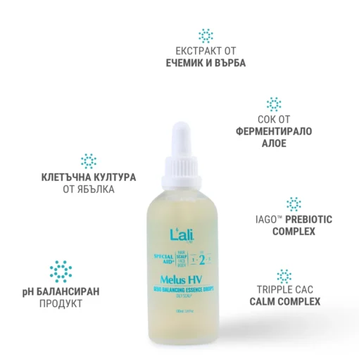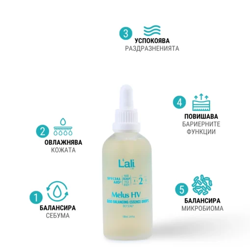 Melus HV | sebo balancing essence drops Серия: SPECIAL AID® Обем: 100мл След почистване на кожата, на преден план излизат специфичните за всеки организъм несъвършенства. За борба с тях използвай комплекс от специализирани пребиотични продукти с интензивен ефект и концентрирана сила, които отговарят на всички нужди. Формулиран с активни съставки, които балансират производството на себум и ефективно успокояват и защитават скалпа от външните стресори.