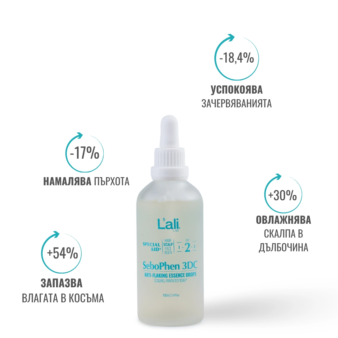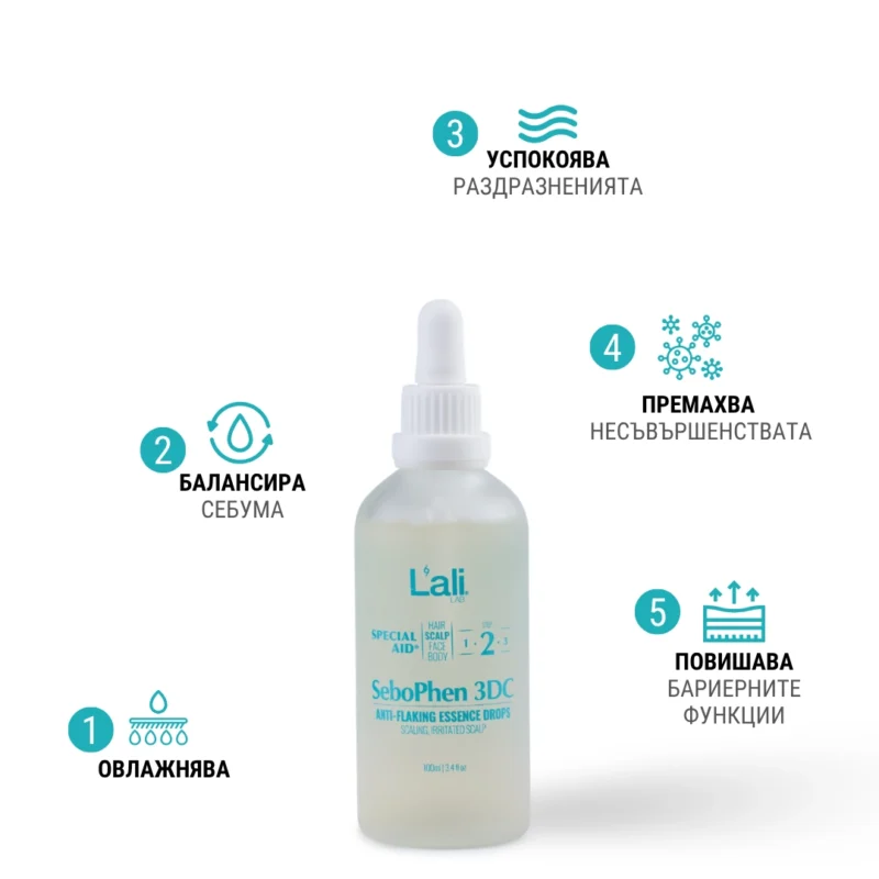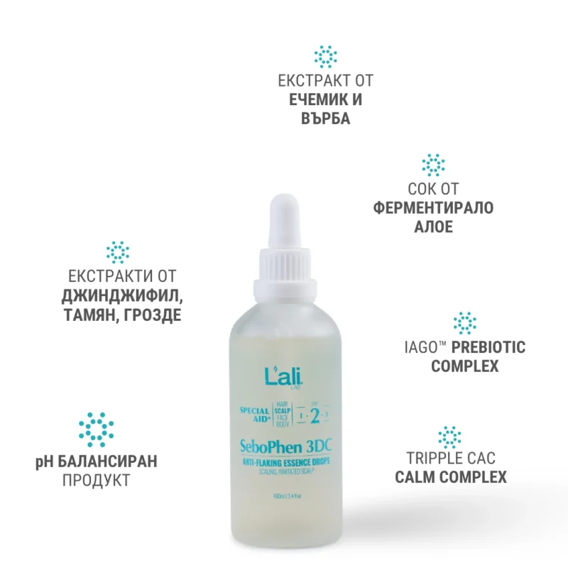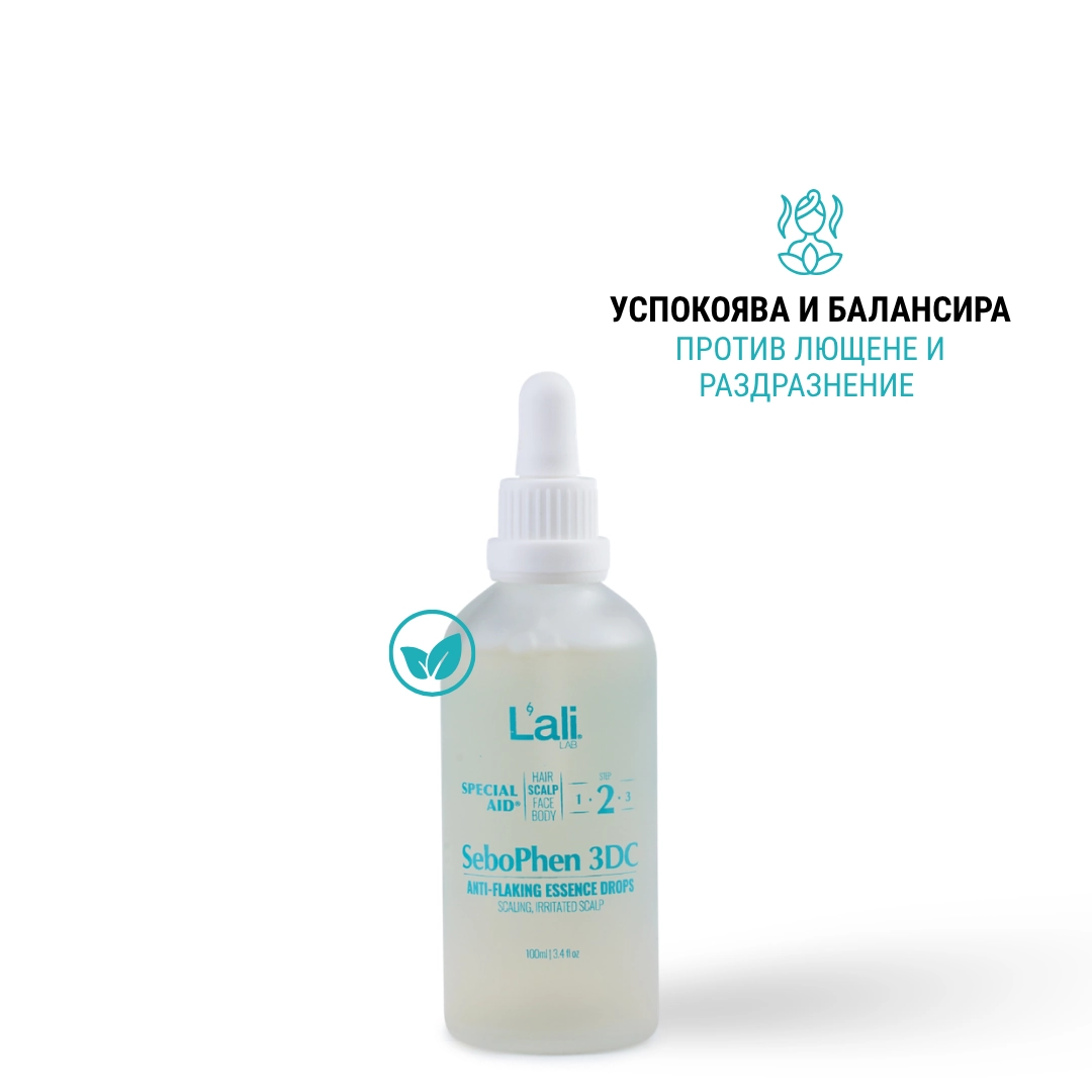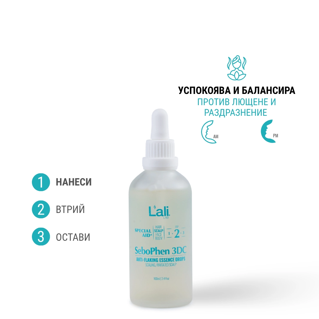 SeboPhen 3DC | anti-flaking essence drops Серия: SPECIAL AID® Обем: 100мл След почистване на кожата, на преден план излизат специфичните за всеки организъм несъвършенства. За борба с тях използвай комплекс от специализирани пребиотични продукти с интензивен ефект и концентрирана сила, които отговарят на всички нужди. Формулирана с активни съставки, които успокояват и заздравяват раздразнения и лющещ се скалп.