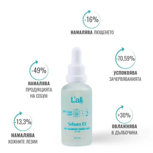 ✓ Намаляват броя на кожните лезии, свързани с акне (-13,3%, in vivo тест)