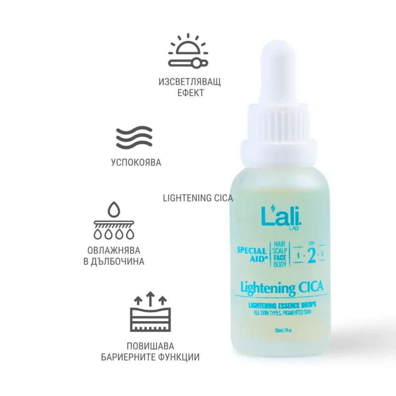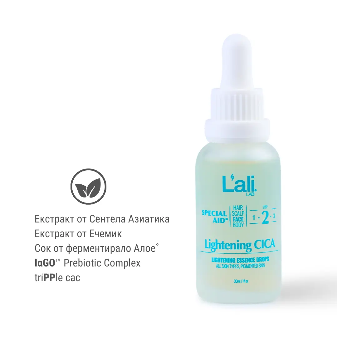 Lightening CICA | Изсветляващи есенциални капки за лице са есенциални капки имат нежен изсветляващ ефект, които подпомагат успокояването на кожата, редуцирането на видими неравности и възвръщането на естествения ѝ блясък. Натурален продукт, създаден като ежедневен ритуал за грижа, който с клинично тествани активни съставки спомага за по-чист, свеж и хармоничен тен - без агресия и без компромис с чувствителната кожа.