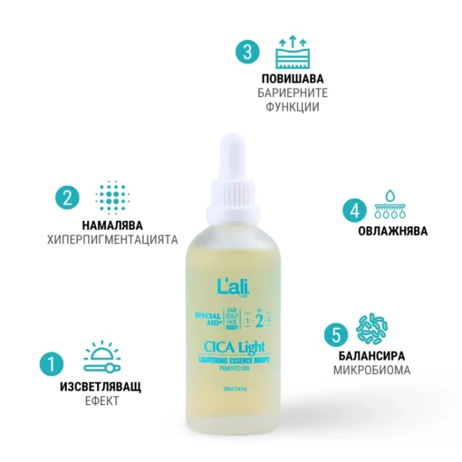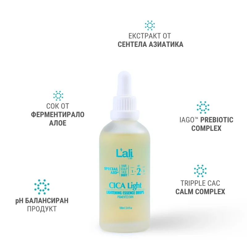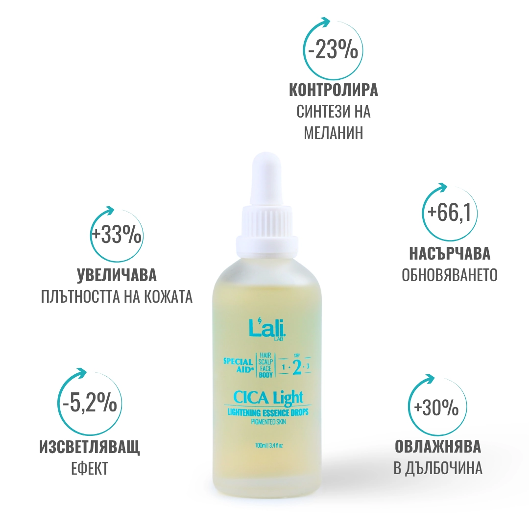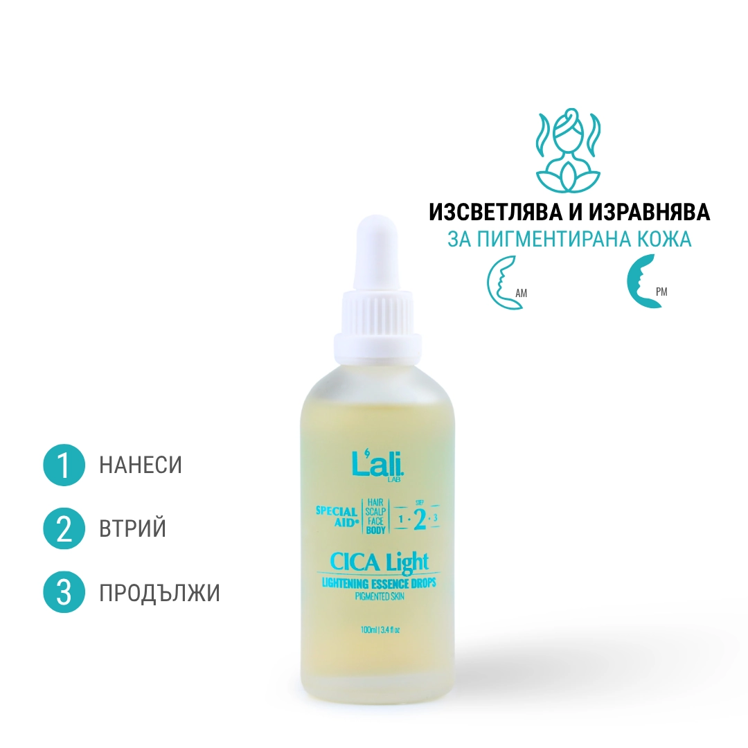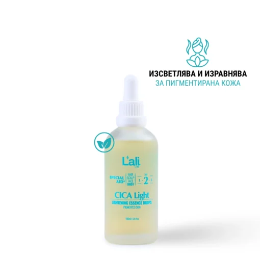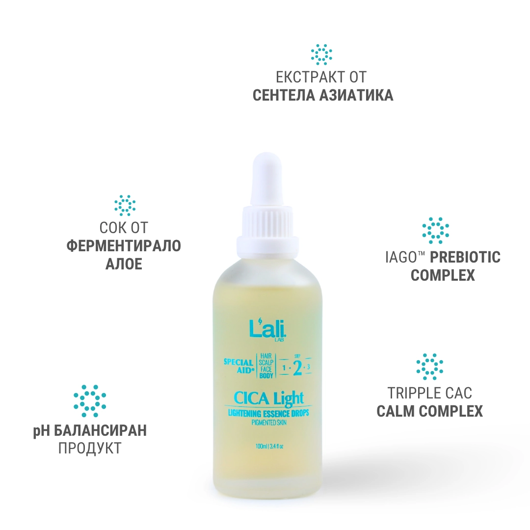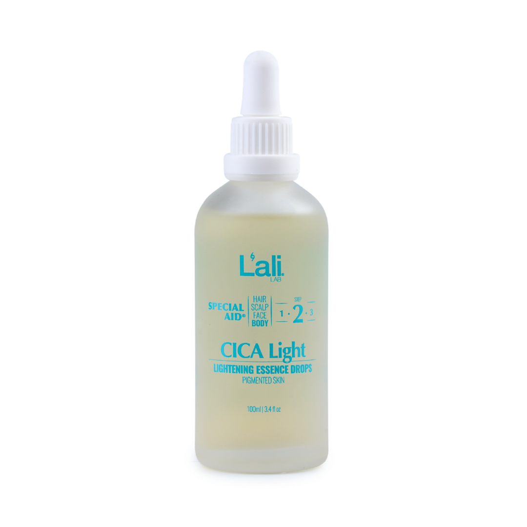 CICA Light | lightening essence drops Серия: SPECIAL AID® Обем: 100мл След почистване на кожата, на преден план излизат специфичните за всеки организъм несъвършенства. За борба с тях използвай комплекс от специализирани пребиотични продукти с интензивен ефект и концентрирана сила, които отговарят на всички нужди. Формулиран с активни съставки, които спомагат за контрола върху синтезата на меланин, осигурявайки изсветляващ ефект.