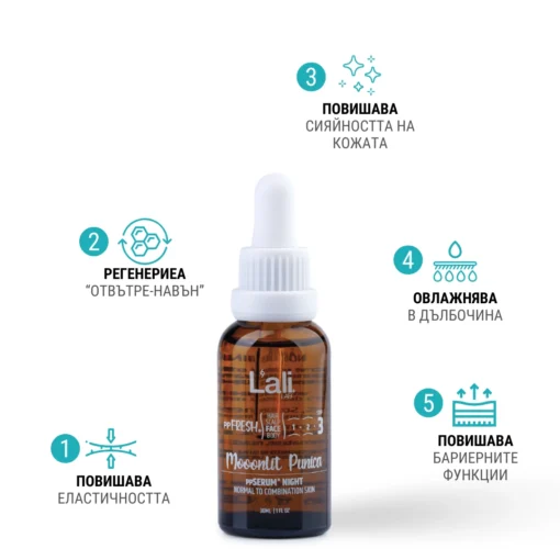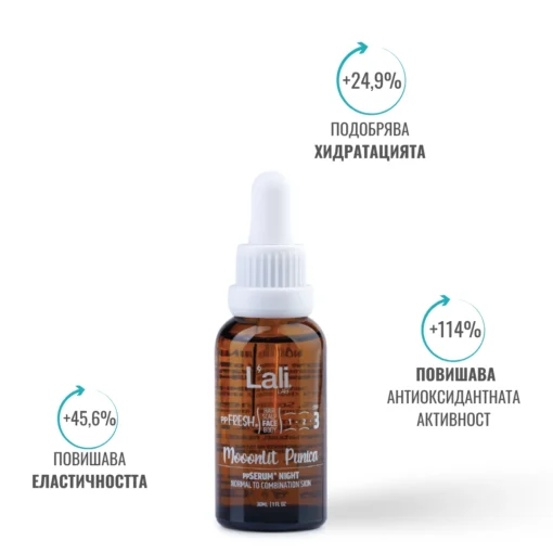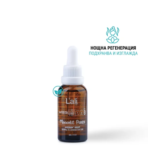 Moonlit Punica | ррSERUM® NIGHT | 30мл Серия: ppFRESH® Обем: 30мл Предвид вредите, които нанася градското замърсяване и модерния начин на живот, използването на допълнителна защита е крайно необходимо. Финишираща грижа за защита, подхранване и подсилване на собствените регенеративни системи на принципа отвътре-навън. Предназначен за борба с негативните последствия от съвременния начин на живот, замърсяванията от околната среда и дигиталното замърсяване. Използвай винаги в комбинация с Salica Intense ppSERUM® ACTIVATOR.