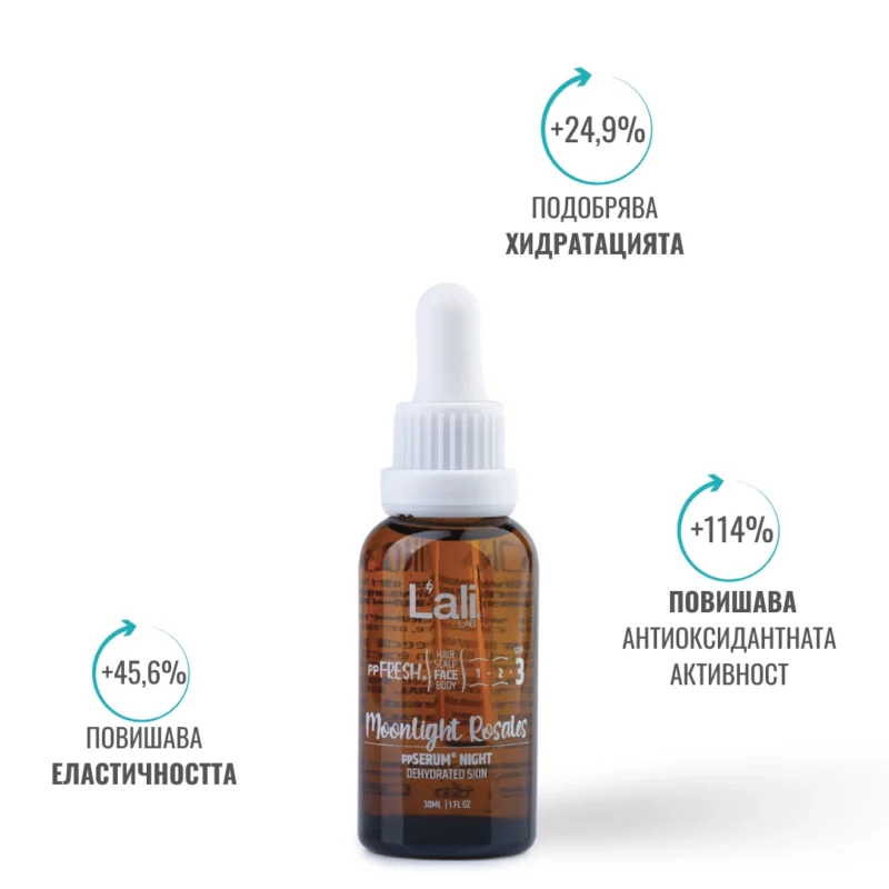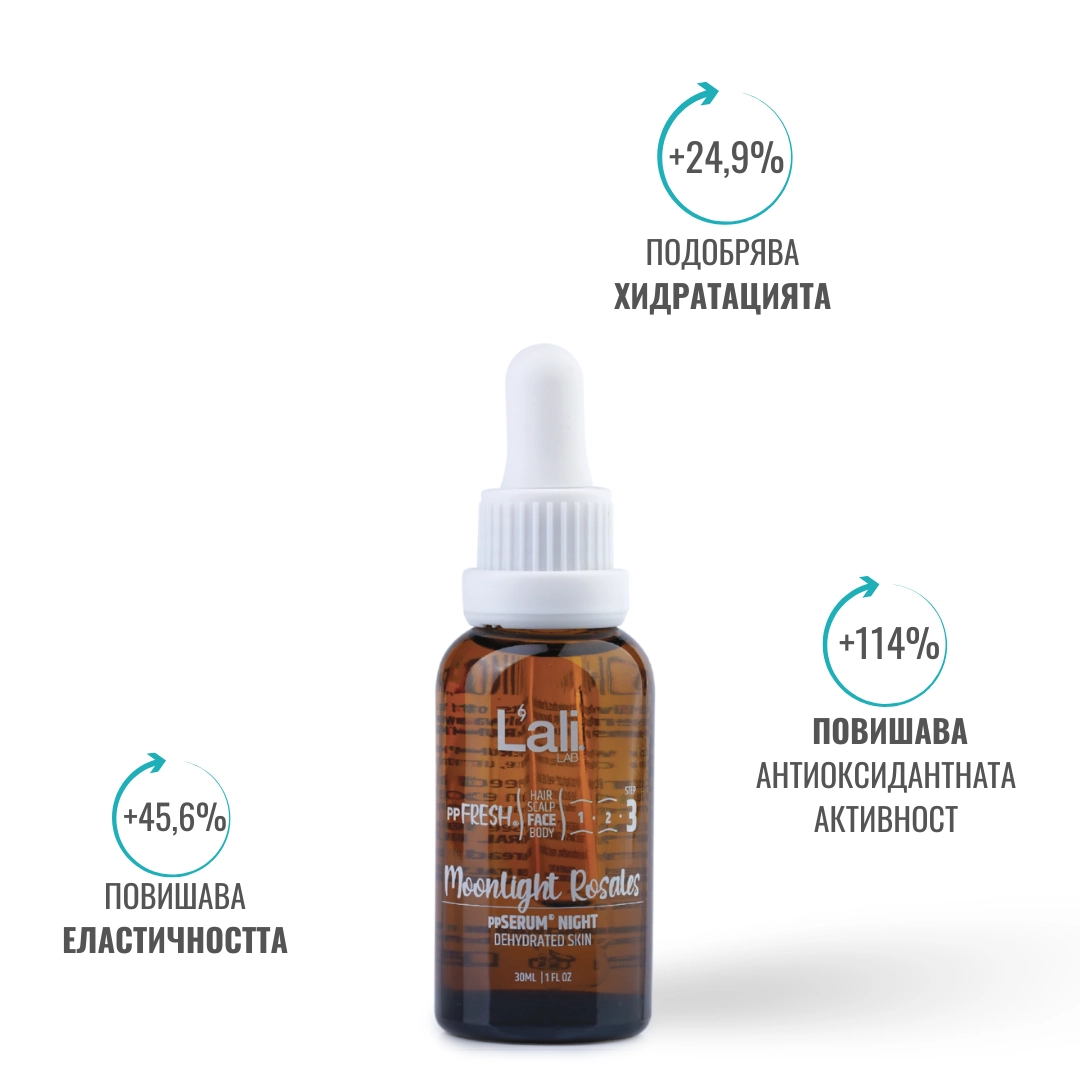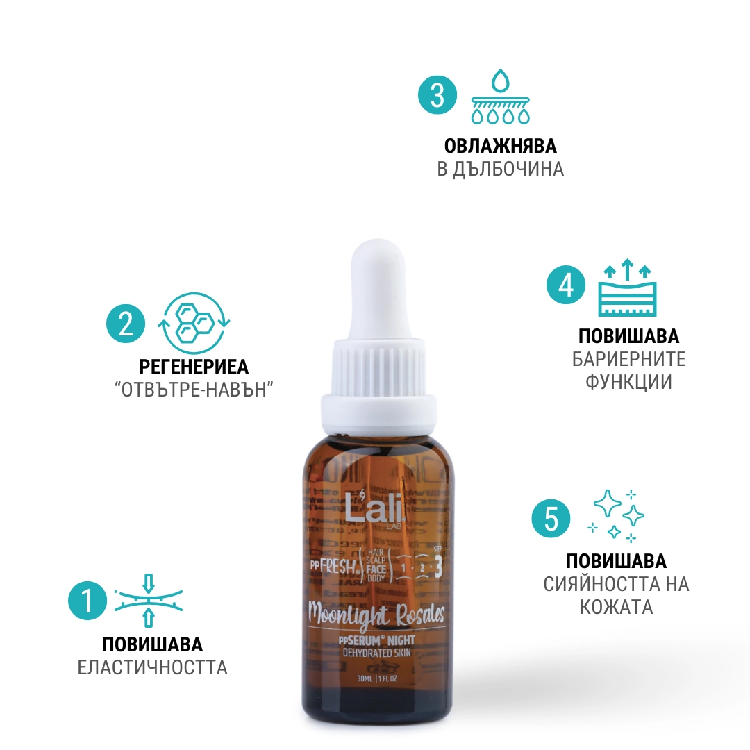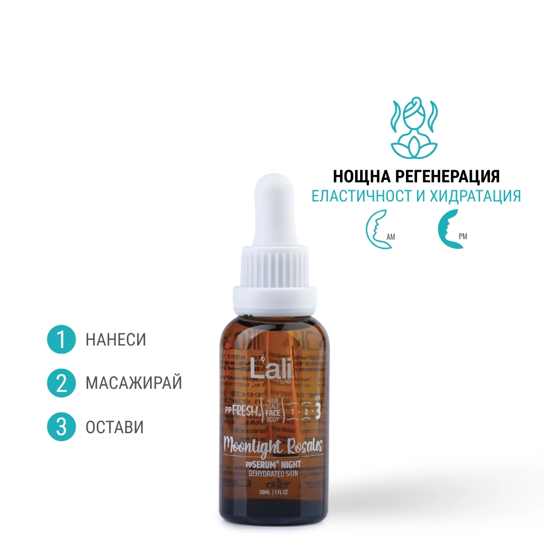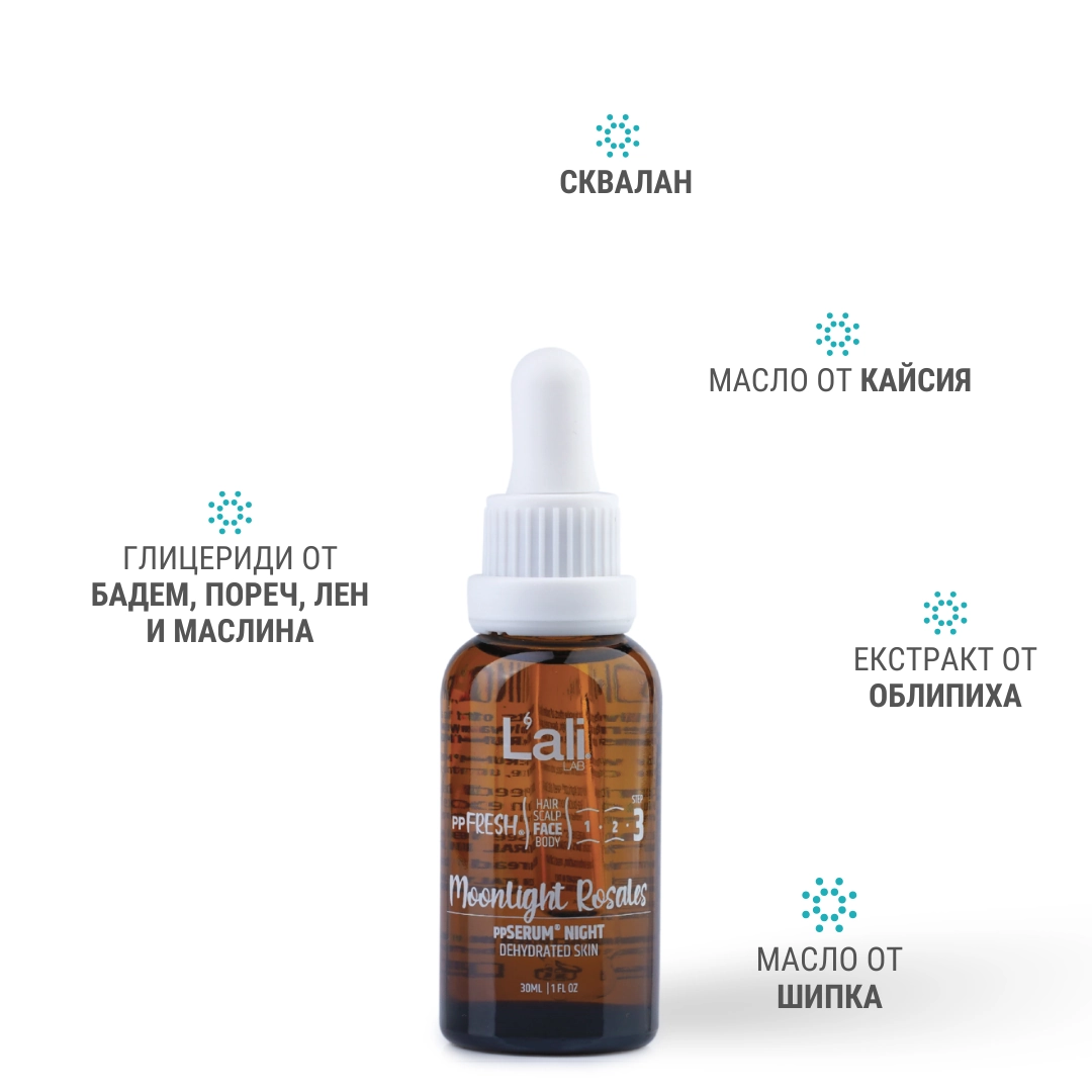Moonlit Rosales ppSERUM® NIGHT Серия: ppFRESH® Обем: 30мл Предвид вредите, които нанася градското замърсяване и модерния начин на живот, използването на допълнителна защита е крайно необходимо. Финишираща грижа за защита, подхранване и подсилване на собствените регенеративни системи на принципа отвътре-навън. Предназначен за борба с негативните последствия от съвременния начин на живот, замърсяванията от околната среда и дигиталното замърсяване. Използвай винаги в комбинация с Astra Intense ppSERUM® ACTIVATOR.