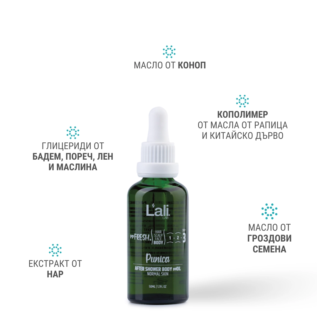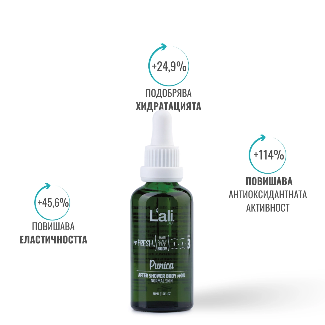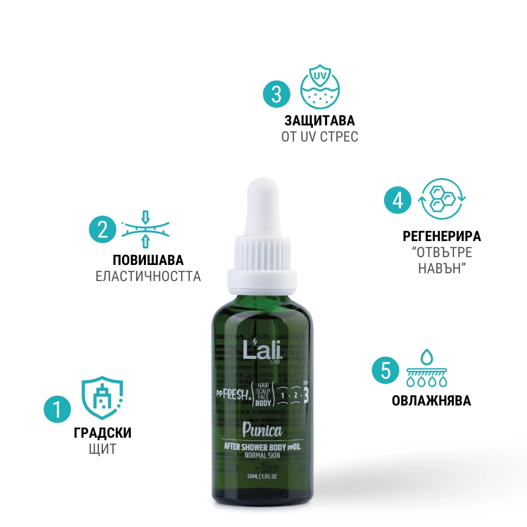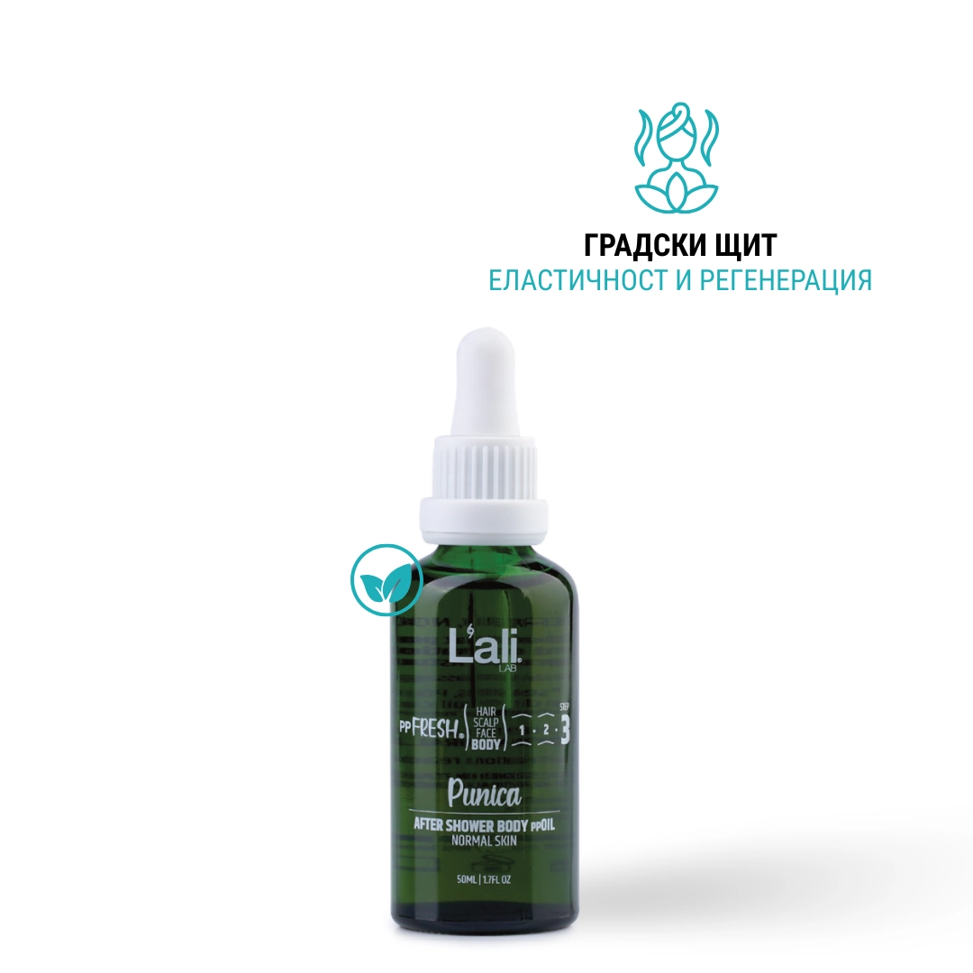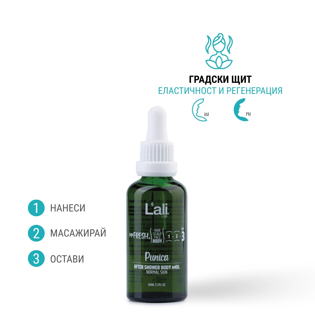 Punica AFTER SHOWER BODY ppOIL Серия: ppFRESH® Обем: 50мл Предвид вредите, които нанася градското замърсяване и модерния начин на живот, използването на допълнителна защита е крайно необходимо. Финишираща грижа за защита, подхранване и подсилване на собствените регенеративни системи на принципа отвътре-навън. Формулиран с активни съставки, които предпазват откритата кожа от стресорите от околната среда и дехидратацията, увеличават еластичността на кожата и подобряват овлажняването. Използвай за борба с негативните ефекти от съвременния начин на живот, стресови фактори от околната среда и замърсяване.