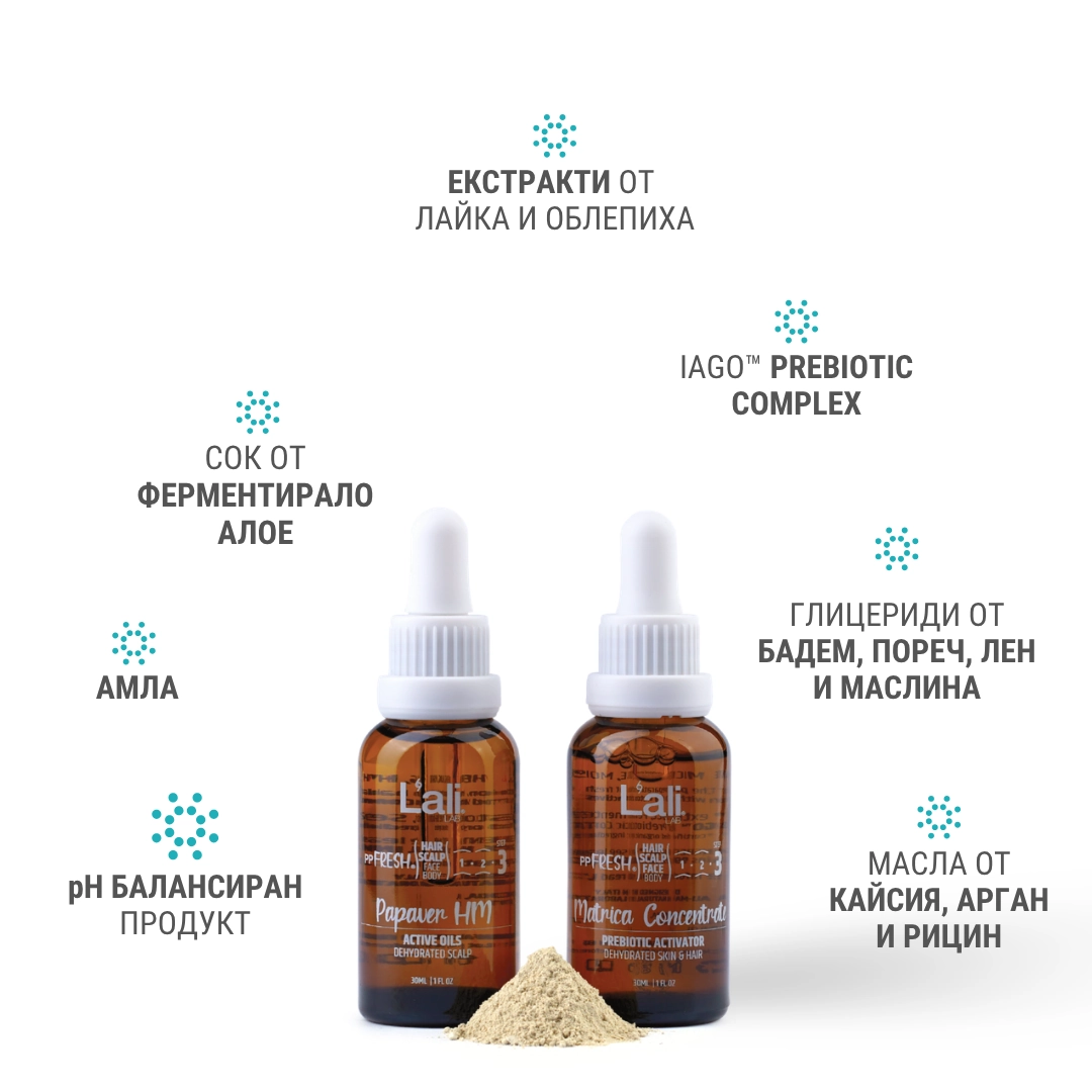 Екстракт от Лайка˚; Сок от ферментирало Алое˚; D-Пантенол; Масло от Арган˚; Масло от Рицин˚; Масло от Kайсия˚; Екстракт от Облепиха; Глицериди и мастни киселини от Бадем, Пореч, Лен и Маслина; Амла; Хума; Лайка; IαGO™ Prebiotic Complex; triPPle cac™
