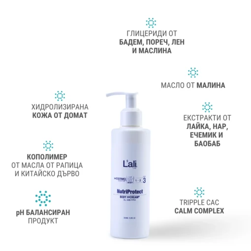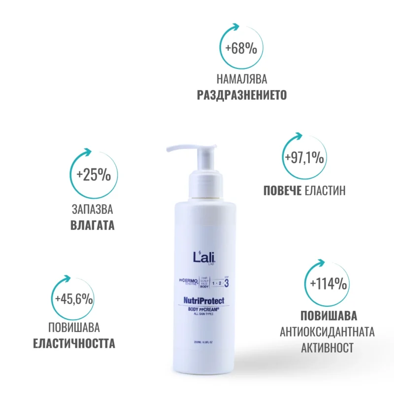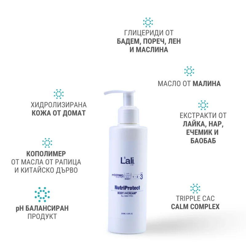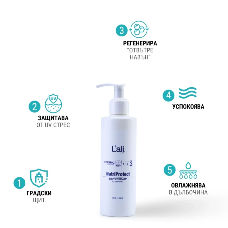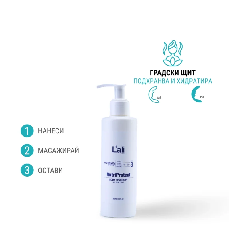 NutriProtect | BODY ppCREAM® Серия: ppDERMO® SENSITIVE Обем: 200мл Предвид вредите, които нанася градското замърсяване и модерния начин на живот, използването на допълнителна защита е крайно необходимо. Финишираща грижа за защита, подхранване и подсилване на собствените регенеративни системи на принципа отвътре-навън. Предназначен за защита на кожата от увреждане, причинено от влиянието на околната среда, дразнещи химикали и замърсители. Продуктът предпазва чрез образуване на гъвкав и гладък филм за удобно и равномерна защита.