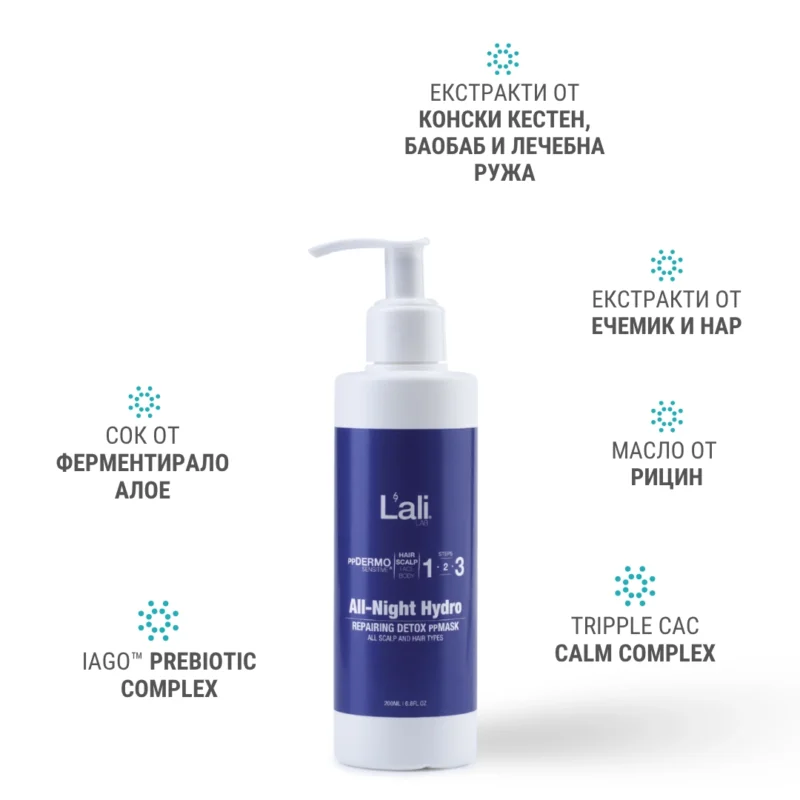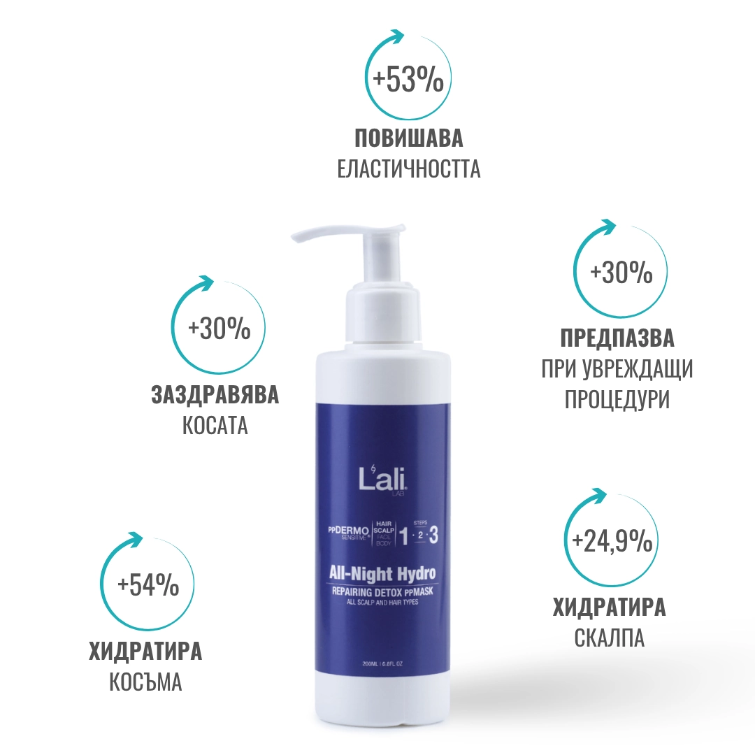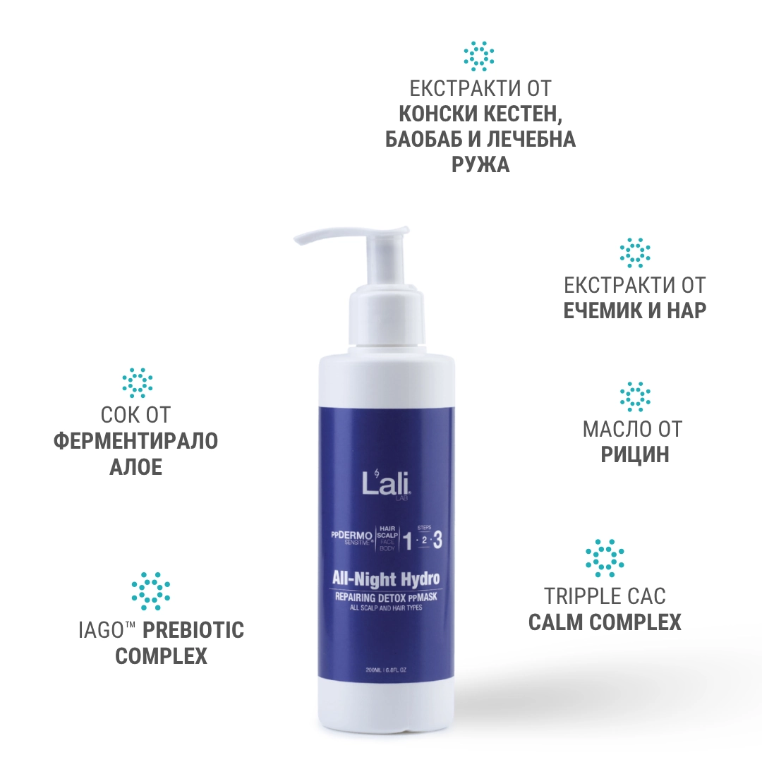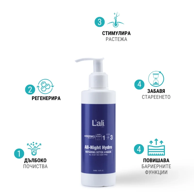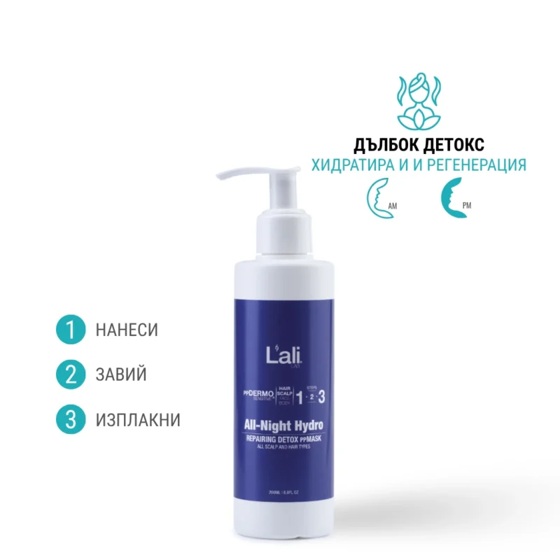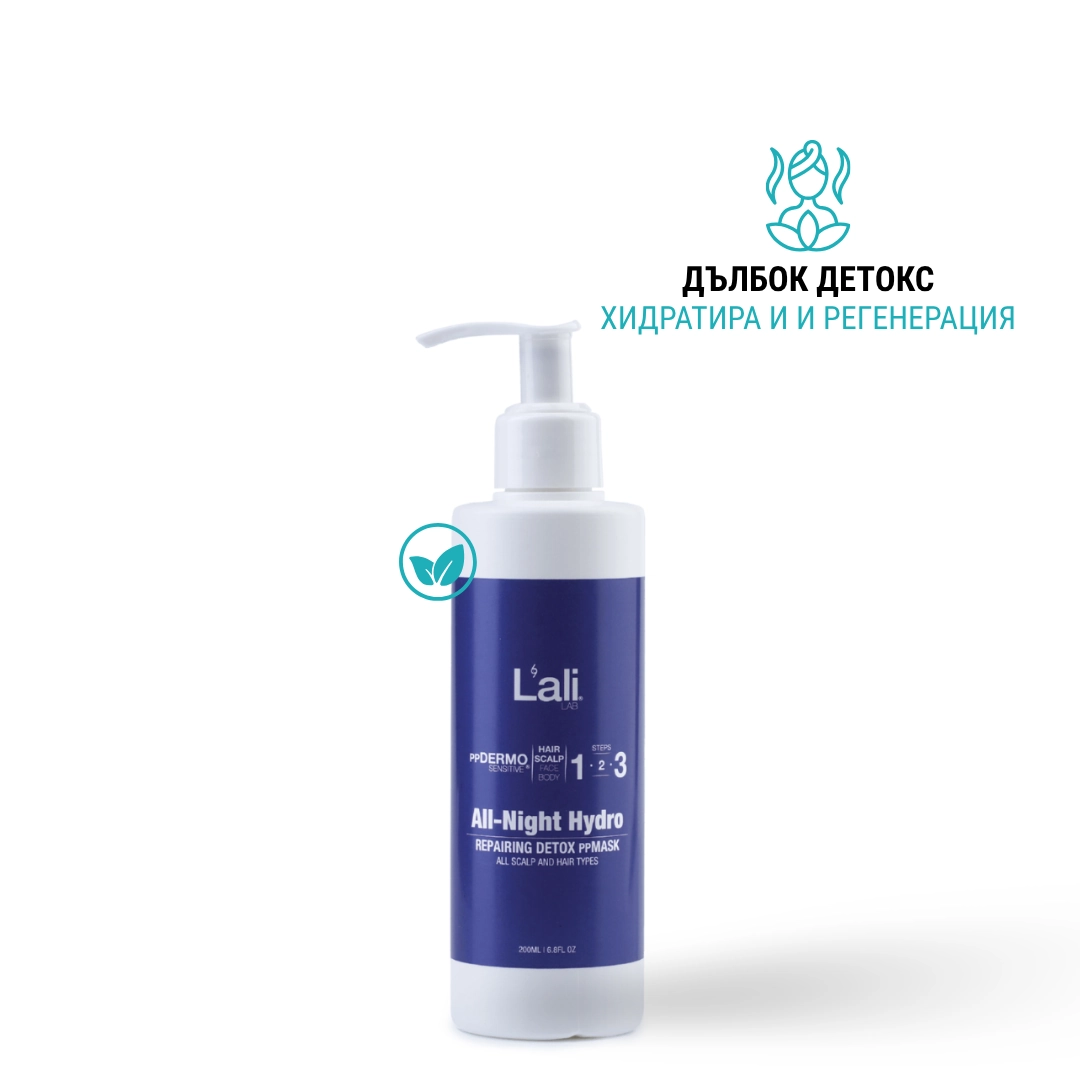 All-Night Hydro | REPAIRING DETOX ppMASK Серия: ppDERMO® SENSITIVE Обем: 200мл Всяка грижа започва с почистване. За да могат селектираните за теб активни съставки да достигнат в дълбоките слоеве на кожата е необходимо да бъдат премахнати замърсяванията от околната среда, мастни наслоявания и остатъци от козметични продукти. Формулирана с активни съставки, които детоксикират, възстановяват увредената коса, увеличават на здравината на скалпа и косата, насърчават растежа и хидратацията на косъма. Използвай за борба с негативните ефекти от съвременния начин на живот, стресови фактори от околната среда и замърсяване.