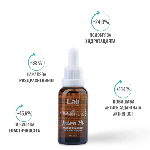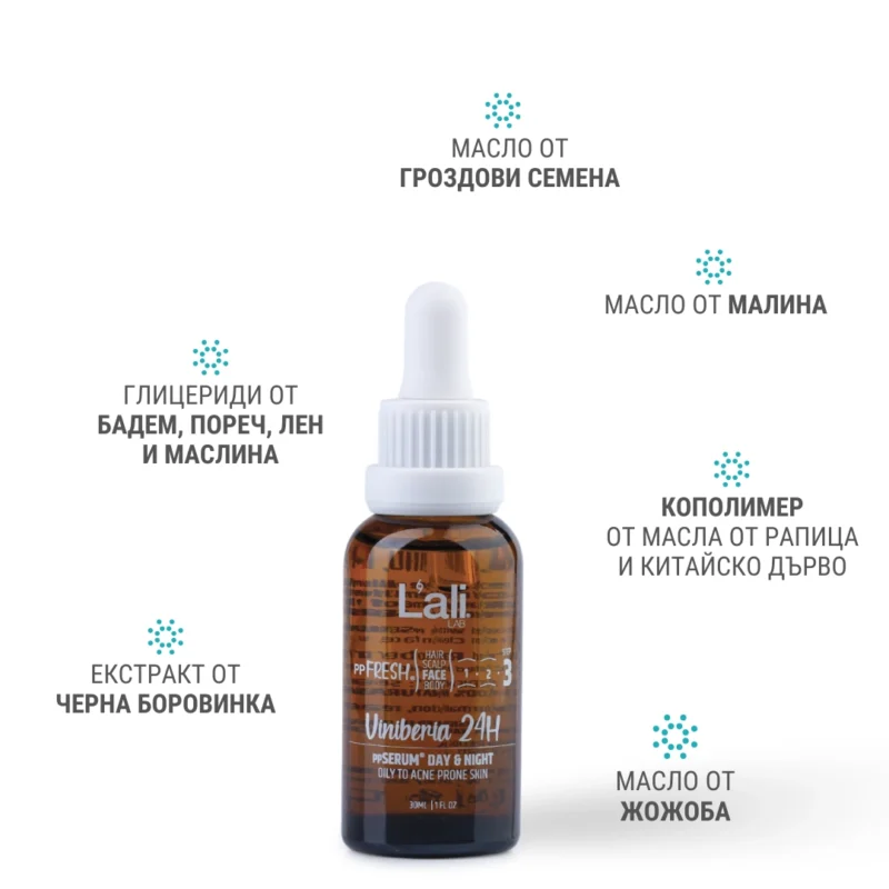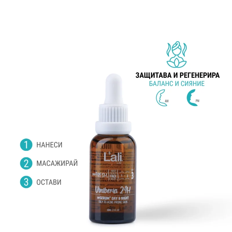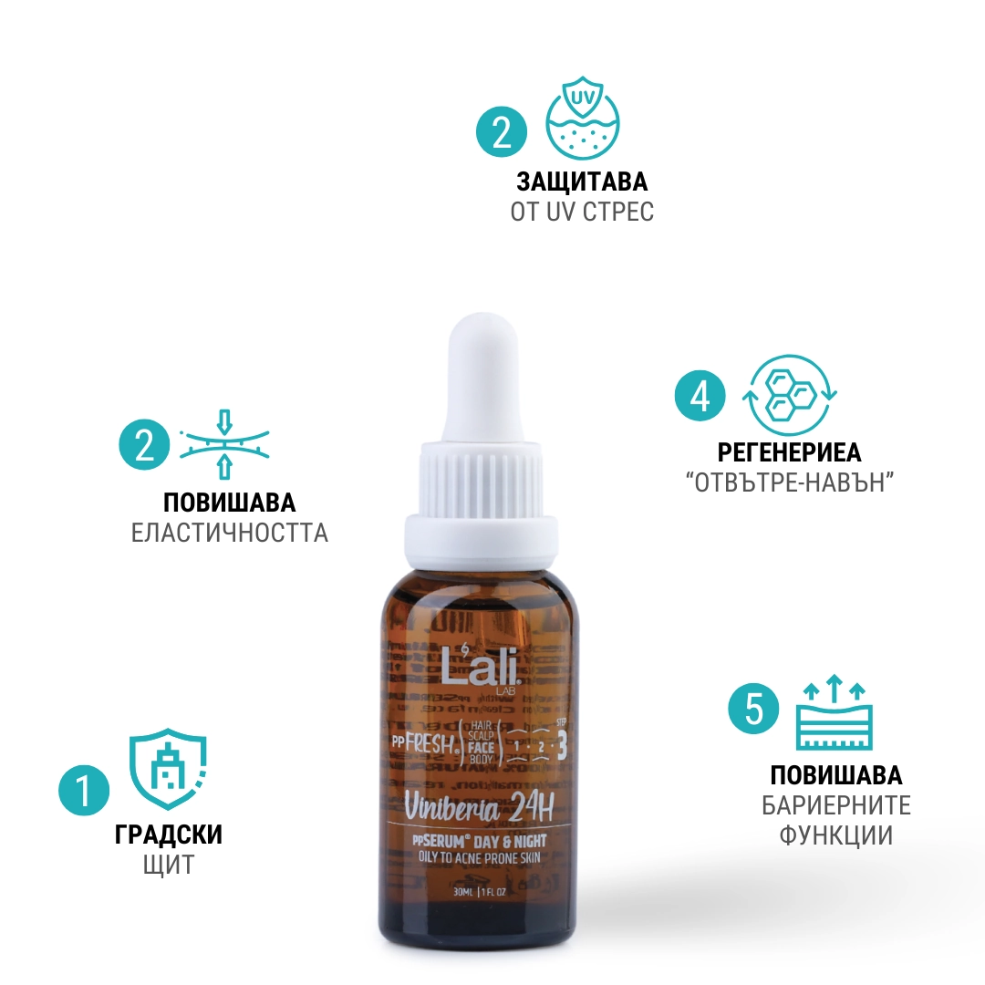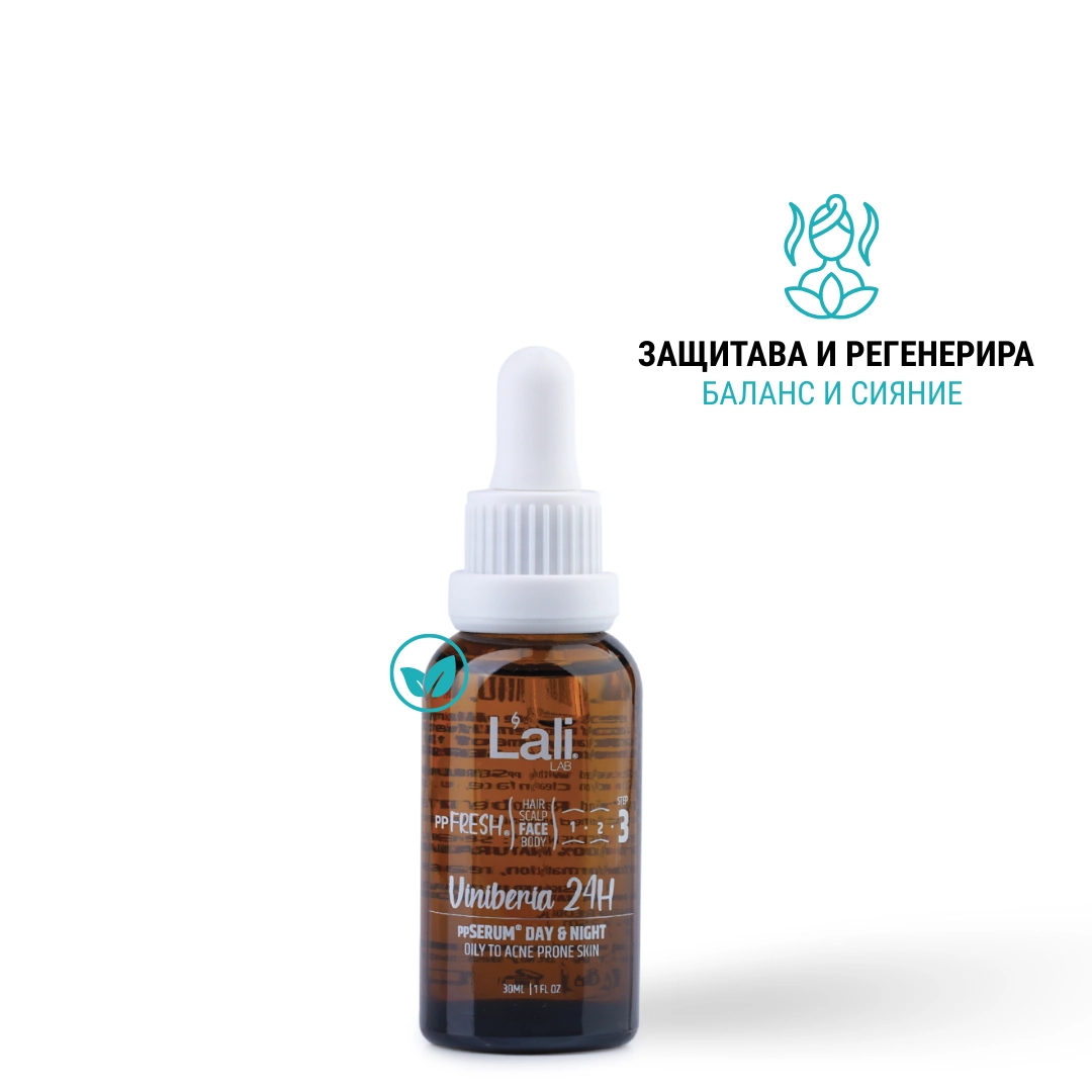 Viniberia 24H ppSERUM® DAY & NIGHT Серия: ppFRESH® Обем: 30мл Предвид вредите, които нанася градското замърсяване и модерния начин на живот, използването на допълнителна защита е крайно необходимо. Финишираща грижа за защита, подхранване и подсилване на собствените регенеративни системи на принципа отвътре-навън. Предназначен за борба с негативните последствия от съвременния начин на живот, замърсяванията от околната среда и дигиталното замърсяване. Използвай винаги в комбинация с Viniber Intense ppSERUM® ACTIVATOR