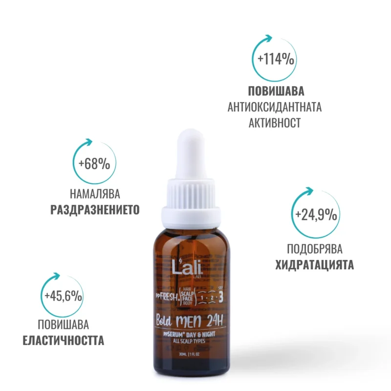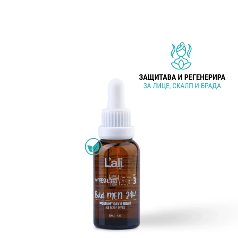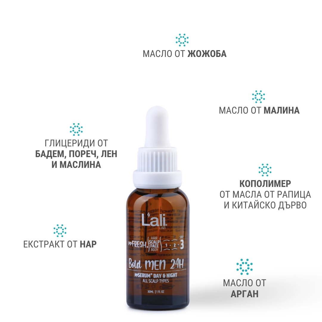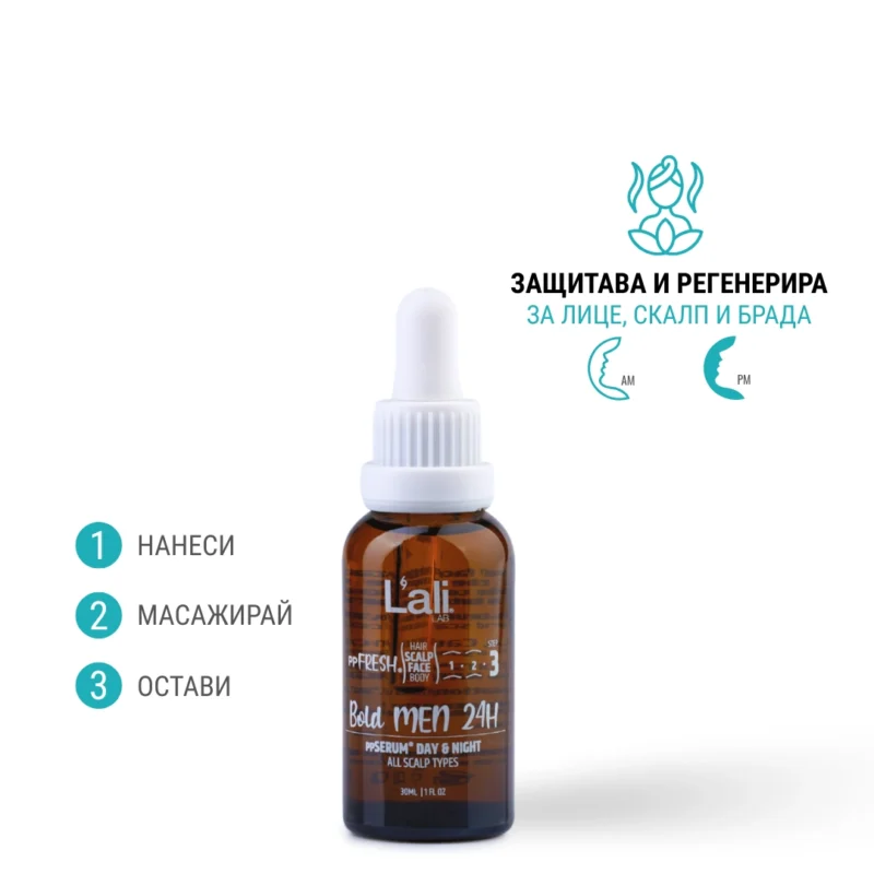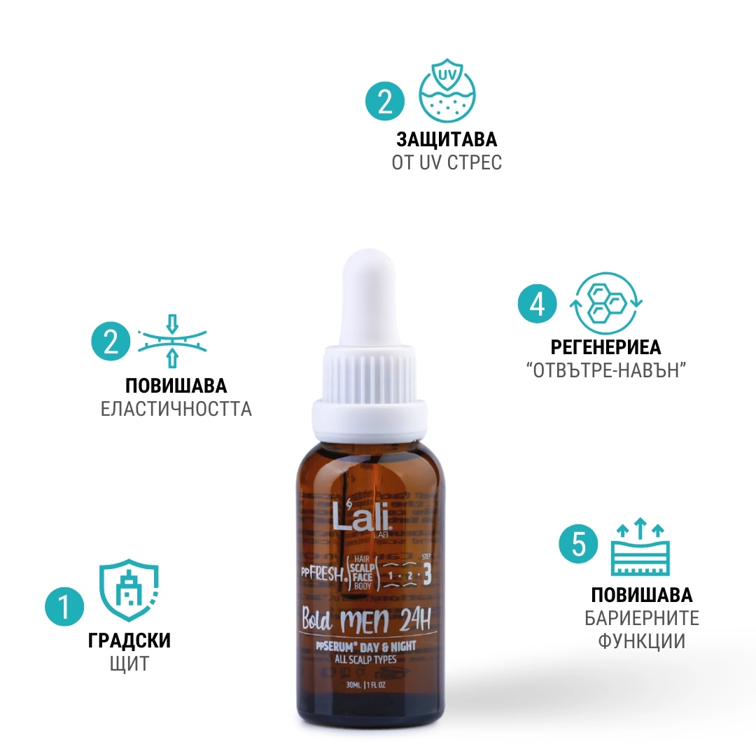 Bold MEN 24H ррSERUM® DAY & NIGHT. Серия: ppFRESH® Обем: 30мл Използвай винаги в комбинация с: Предвид вредите, които нанася градското замърсяване и модерния начин на живот, използването на допълнителна защита е крайно необходимо. Финишираща грижа за защита, подхранване и подсилване на собствените регенеративни системи на принципа отвътре-навън. Предпазва открития скалп и лицето от дехидратация и стресорите на околната среда. Предназначен за борба с негативните последствия от съвременния начин на живот, стресорите от околната среда и замърсяванията.