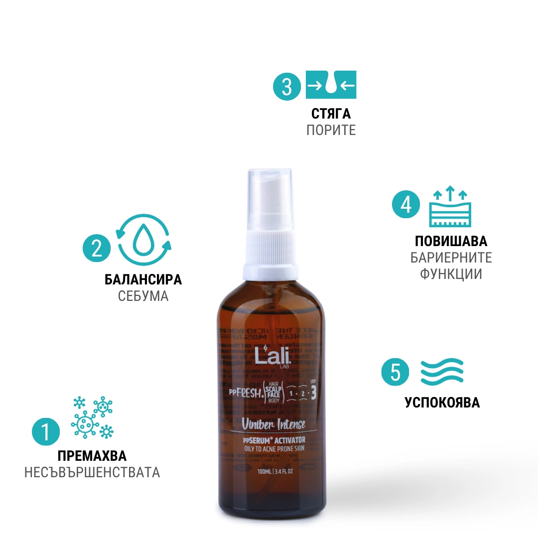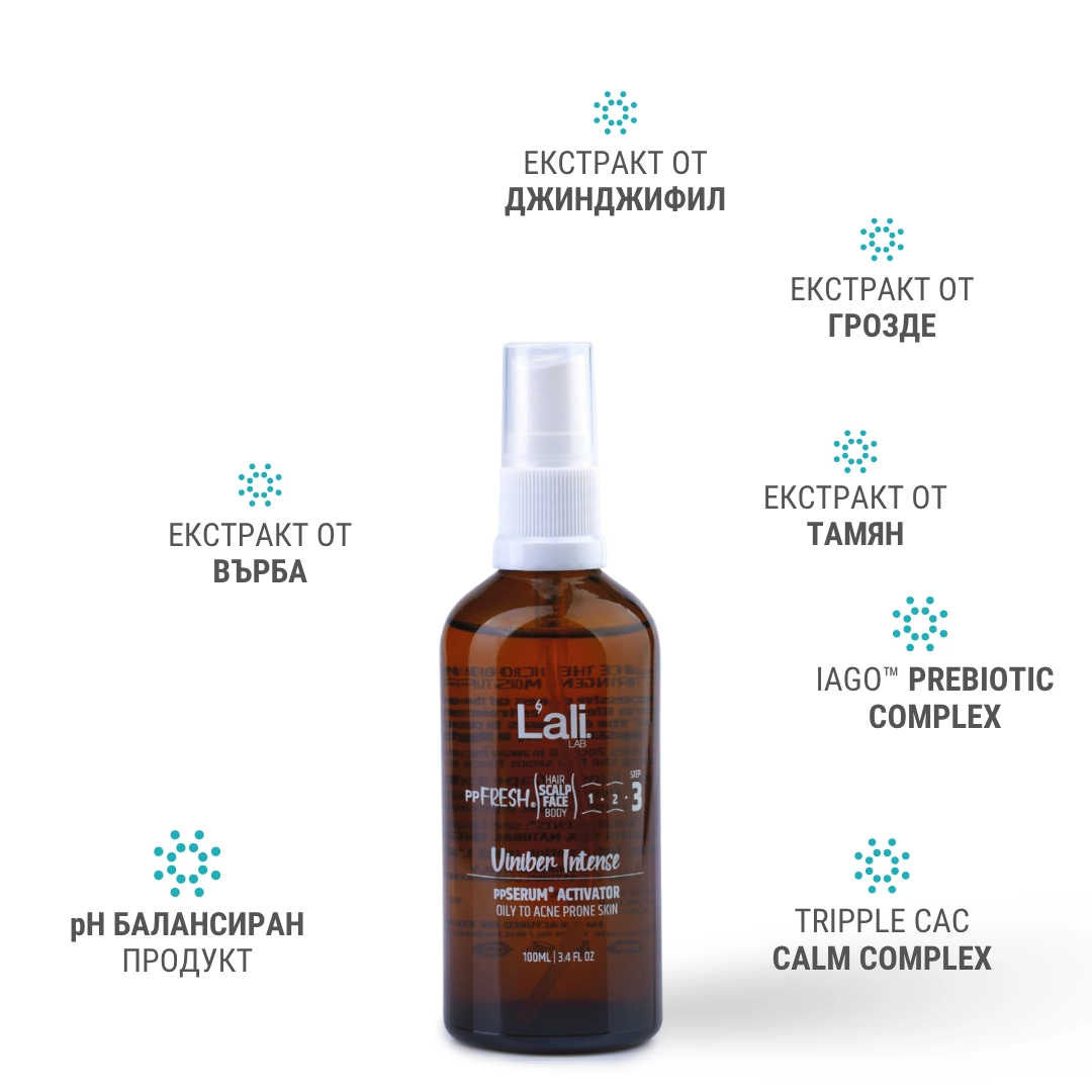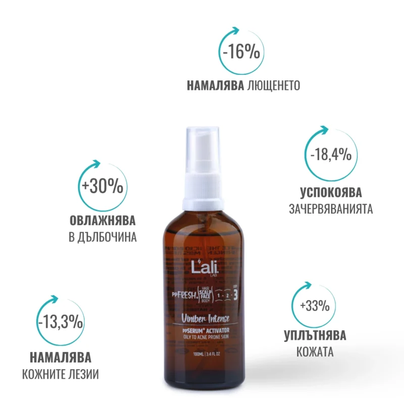 Viniber Intense ppSERUM® ACTIVATOR Серия: ppFRESH® Обем: 100мл Предвид вредите, които нанася градското замърсяване и модерния начин на живот, използването на допълнителна защита е крайно необходимо. Финишираща грижа за защита, подхранване и подсилване на собствените регенеративни системи на принципа отвътре-навън. Предназначен за използване по всяко време на деня, винаги в комбинация с Viniberia 24H, ppSERUM® DAY&NIGHT, или Bold MEN 24H ррSERUM® DAY&NIGHT. Използвай за борба с негативните последствия от съвременния начин на живот, стресорите от околната среда и замърсяванията.