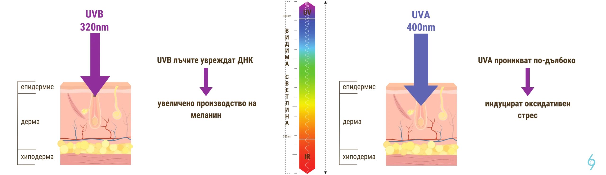 ⚠️ UVA лъчите проникват по-дълбоко и индуцират оксидативен стрес, който също стимулира меланогенезата (синтеза на меланин).